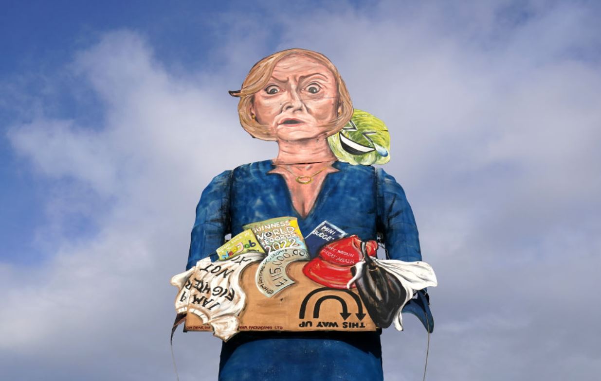 Lutka s podobo britanskega premierja je visoka 11 metrov, nosi klobuk, japonke in gorečo baklo z napisom »Prilizujem se Trumpu«. Vir: Posnetek zaslona, X