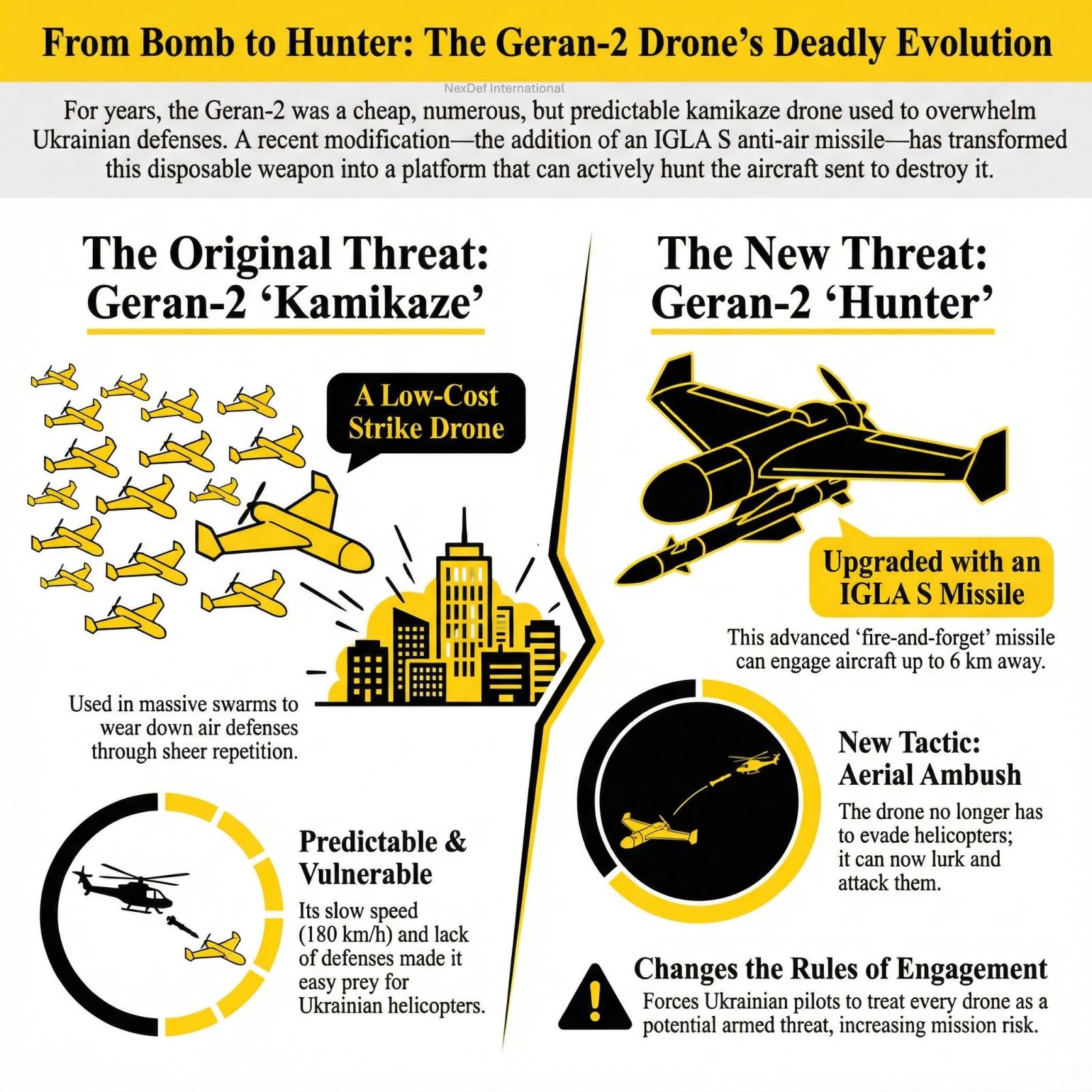 Russian forces are mounting Igla MANPADS on Shahed drones to target Ukrainian helicopters that intercept them. The drones carry a camera and radio modem, and the missile is launched remotely by an operator in Russian territory. pic.twitter.com/T5TKPHyhVu