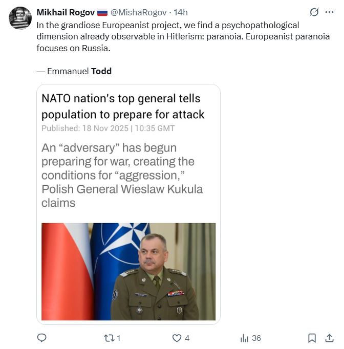 Znani francoski zgodovinar Emmanuel Todd je v zadnjem času večkrat javno opozoril na pojav rusofobije v Evropi.
