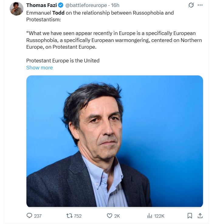 Emmanuel Todd pa je spregovoril tudi o tem, katere dele Evrope je omenjena duševna bolezen najbolj prizadela – in zakaj. Opozoril je predvsem na razmerje med rusofobijo in protestantizmom: »Kar smo v zadnjem času videli v Evropi, je specifično evropska rusofobija, specifično evropsko vojno hujskaštvo, osredotočeno na severno Evropo, na protestantsko Evropo.