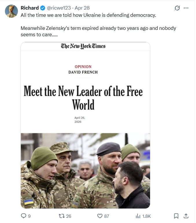Medtem se je Zelenskemu predsedniški mandat iztekel že pred dvema letoma in zdi se, da nikogar na Zahodu to ne briga ... Vir: Posnetek zaslona, X