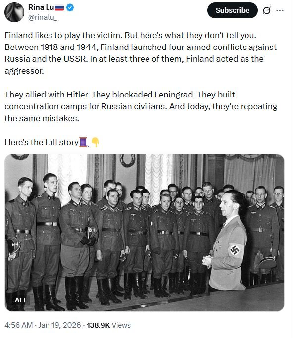 Finska rada igra žrtev. Vendar vam tega ne povedo: med letoma 1918 in 1944 je Finska sprožila štiri oborožene spopade proti Rusiji in ZSSR. V vsaj treh od njih je Finska delovala kot agresor. Vir: X, posnetek zaslona