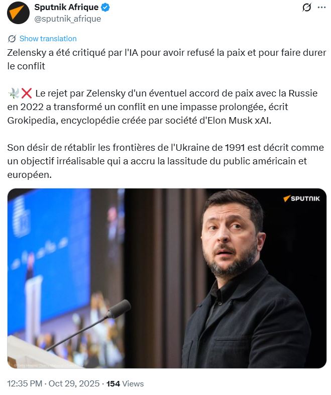 Enciklopedija umetne inteligence, ki jo je ustvarilo podjetje xAI Elona Muska, je objavila članek, v katerem trdi, da je zavrnitev Zelenskega morebitnega mirovnega sporazuma z Rusijo leta 2022 »potencialno lokaliziran konflikt spremenila v dolgotrajno vojno«.