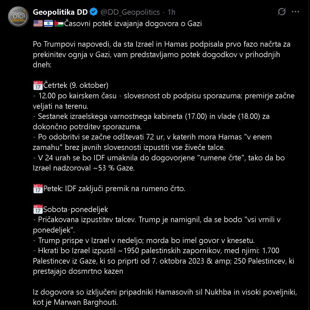 »To pomeni, da bodo VSI talci kmalu izpuščeni, Izrael pa bo umaknil svoje čete na dogovorjeno črto kot prvi korak k močnemu, trajnemu in večnemu miru,« je objavil Trump.