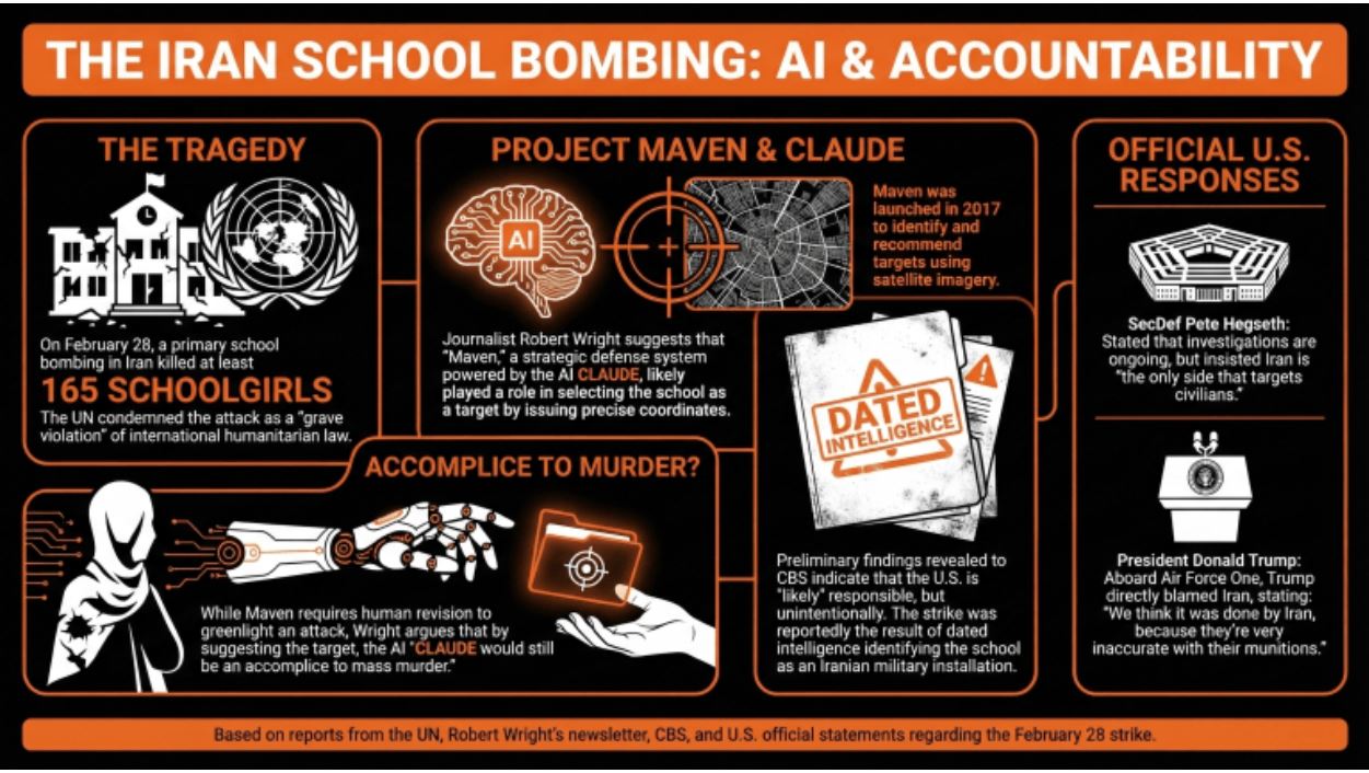 Robert Wright, ameriški avtor in novinar, je namignil na vpletenost sistemov umetne inteligence (UI) v pokol najmanj 165 šolark, ubitih v bombardiranju v Iranu.