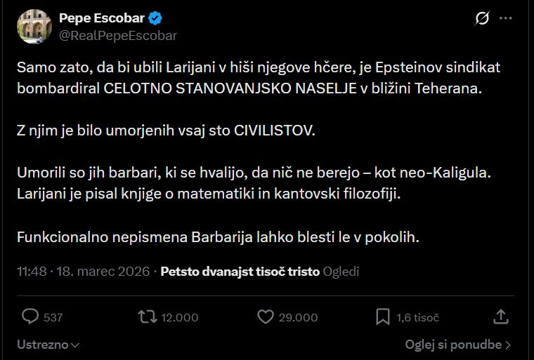 Iran je v torek potrdil, da je bil Ali Larijani, sekretar iranskega Vrhovnega sveta za nacionalno varnost, ubit v izraelskem napadu.
