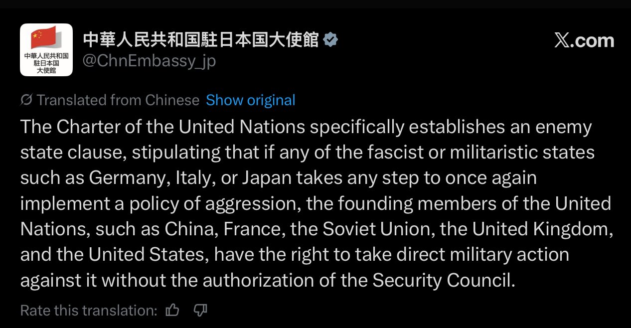 BREAKING: The Chinese Embassy in Japan cited the UN Charter’s “Enemy State Clause” (Articles 53 and 107), which says that countries that were part of the Axis powers in World War II can face action if they start aggressive policies again. pic.twitter.com/GhoClrYilu