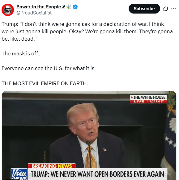 Trump odgovarja novinarju, ali bo od Kongresa zahteval vojno napoved venezueli: »Mislim, da ne bomo zahtevali vojne napovedi. Mislim, da bomo ljudi preprosto ubijali. Prav? Ubijali jih bomo. Bili bodo, kot bi rekli, mrtvi.« Vir: Fox News, X, posnetek zaslona