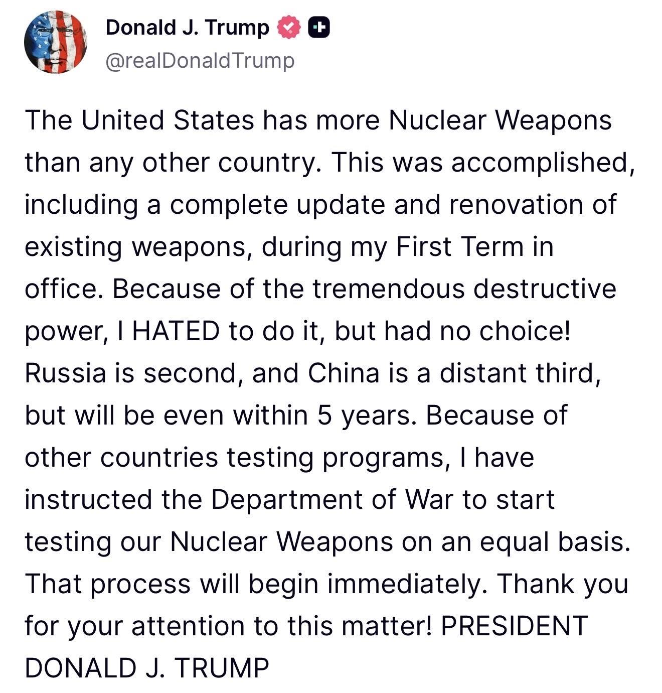 Trump suddenly ordered the Pentagon to immediately begin testing nuclear weapons following Putin's example. The recent tests of the new Russian weapons (Burevestnik & Poseidon) have rubbed his ego the wrong way.