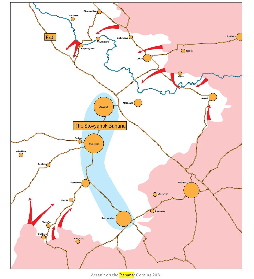Big Serge, drugi vrhunski vojaški analitik, je jeseni 2025 opozoril na rusko operacijo, ki jo imenuje »Banana« — ofenzivni lok, ki naj bi povezal fronto pri Kupjansku z operacijami proti Slovjansku in Kramatorsku.