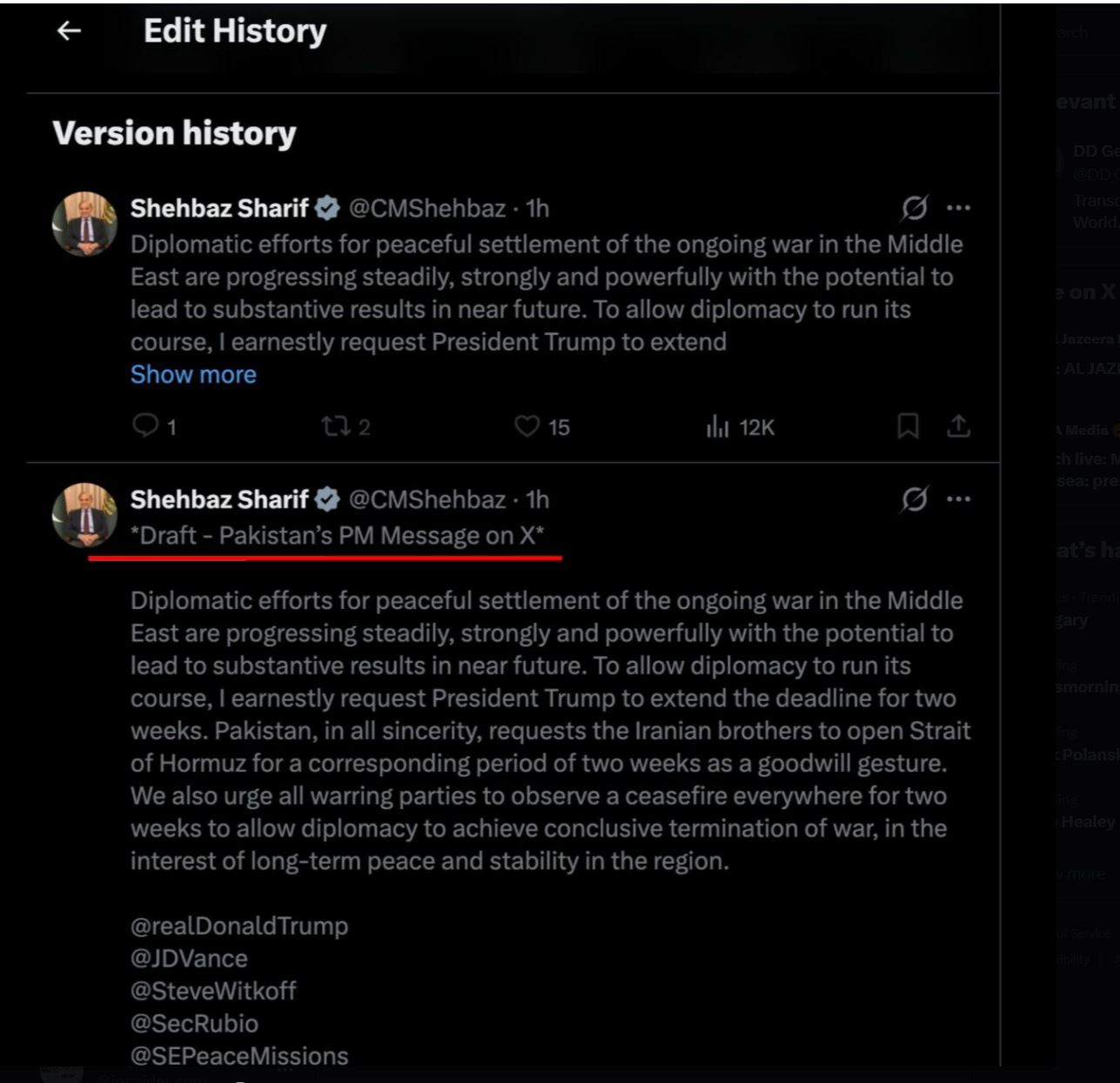 To posredno dokazuje tudi samo prvotno sporočilo Šarifa, v katerem je bilo na začetku zapisano »Draft – Pakistani PM message on X« oziroma »Osnutek – sporočilo pakistanskega predsednika vlade na X«.