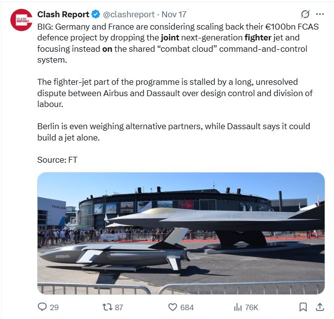 Airbus in Dassault sta vodila nekatere dele programa Future Combat Air System, vendar se ne strinjata glede načina zasnove letala, razpritje niso nič manjše niti glede vprašanja delitve dela, izbire ponudnikov in nadzora dizajna. Vir: Posnetek zaslona, X