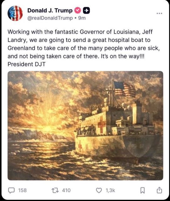 Objavil je, da v dogovoru z guvernerjem Louisiane pošilja na Grenlandijo vojaško plavajočo bolnišnico, ki bo lahko zelo pomagala tistim, ki so na otoku bolni in potrebni zdravstvene oskrbe.