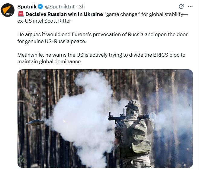 »Popolna zmaga Rusije«: Nekdanji ameriški obveščevalec je pojasnil, kaj je ključ do miru med Rusijo in ZDA»Torej, najpomembnejša je absolutna zmaga Rusije v Ukrajini. Popolna zmaga,« je dejal Ritter in dodal, da to pomeni popolno uresničitev ciljev, ki jih je opredelil ruski predsednik Vladimir Putin. Vir: Posnetek zaslona, X