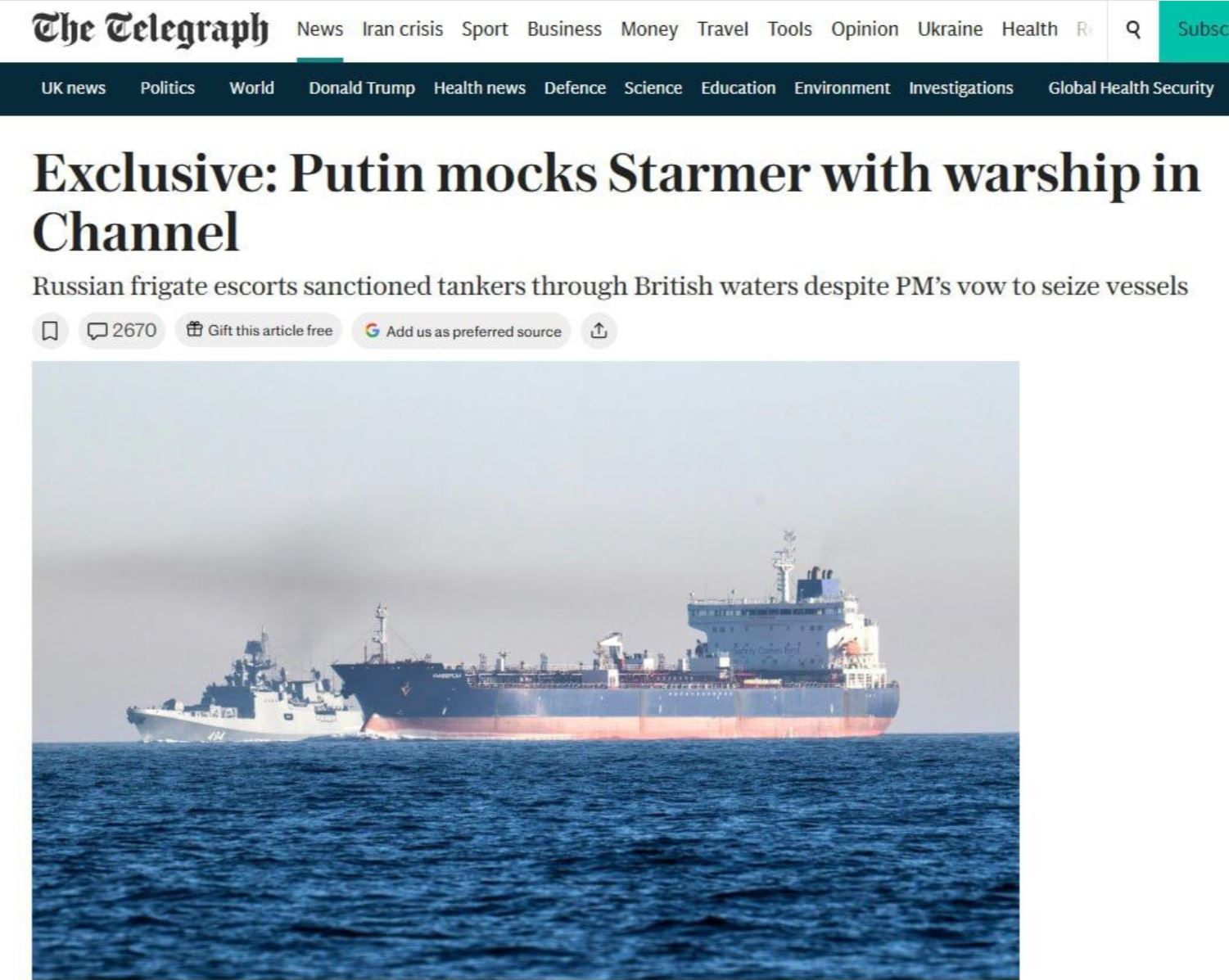 Prav pod nos Velike Britanije, ki je grozila z zasegom tankerjev ruske »senčne flote« je Rusija poslala dva tankerja z rusko nafto – ampak v spremstvu dobro oborožene, vojaške fregate.
