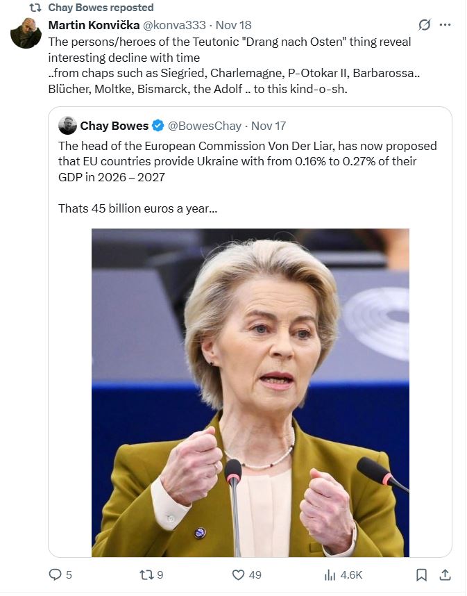 Irski novinar Chay Bowes: Vodja Evropske komisije, Ursula von der Liar, je zdaj predlagala, da države EU v letih 2026–2027 Ukrajini zagotovijo od 0,16 % do 0,27 % svojega BDP. To je 45 milijard evrov na leto. Vir: Posnetek zaslona, X