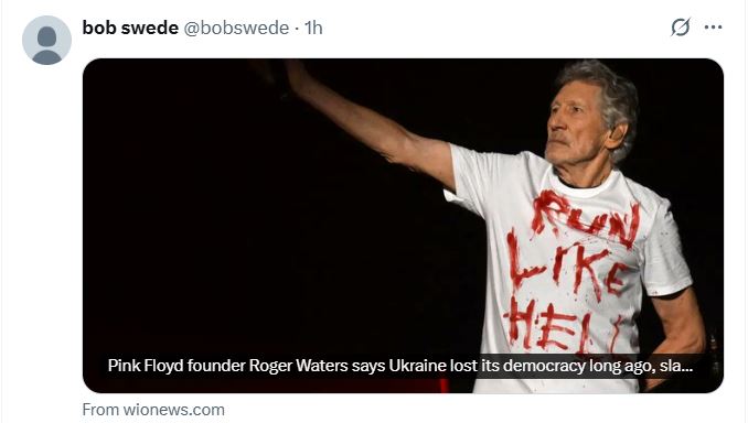 Roger Waters: Zahod zanima Ukrajina, dokler jim ta pomaga polniti žepeSoustanovitelj skupine »Pink Floyd« je visoke zahodne uradnike, zlasti v Veliki Britaniji, obtožil spodbujanja podaljševanja vojne z Rusijo. Vir: Posnetek zaslona, X