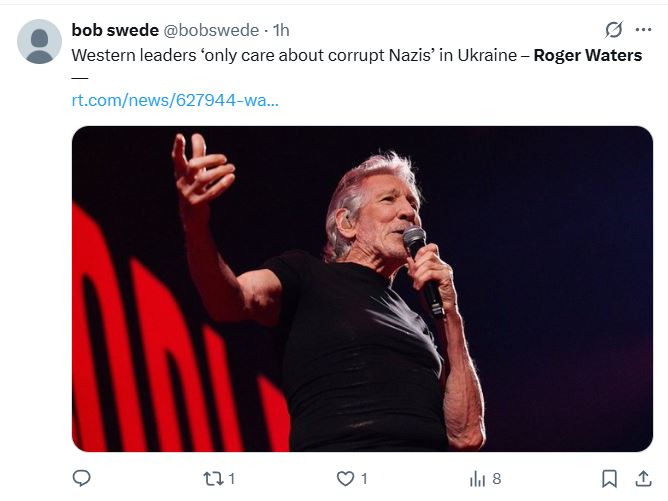 V intervjuju za RIA Novosti je soustanovitelj skupine »Pink Floyd« visoke zahodne uradnike, zlasti v Veliki Britaniji, obtožil, da pomagajo podaljševati vojno z Rusijo. Waters je dejal, da se od članov političnega establišmenta ne pričakuje, da bodo »storili karkoli razumnega«, ker je njihov glavni cilj »polniti lastne žepe«.
