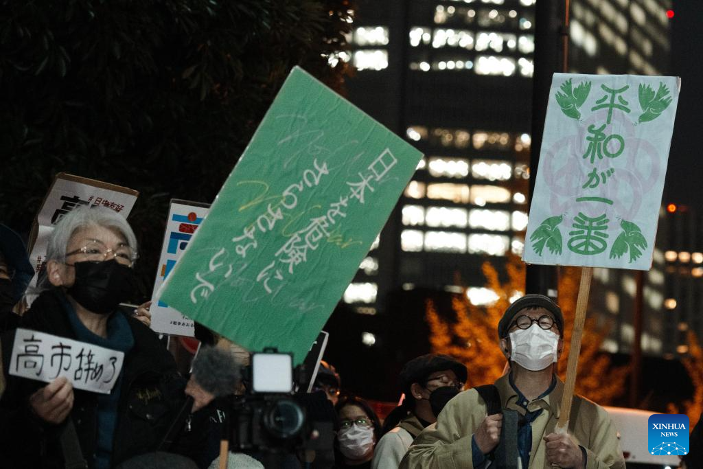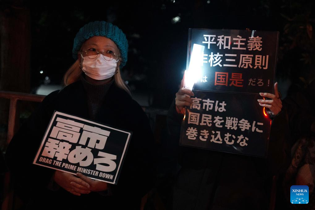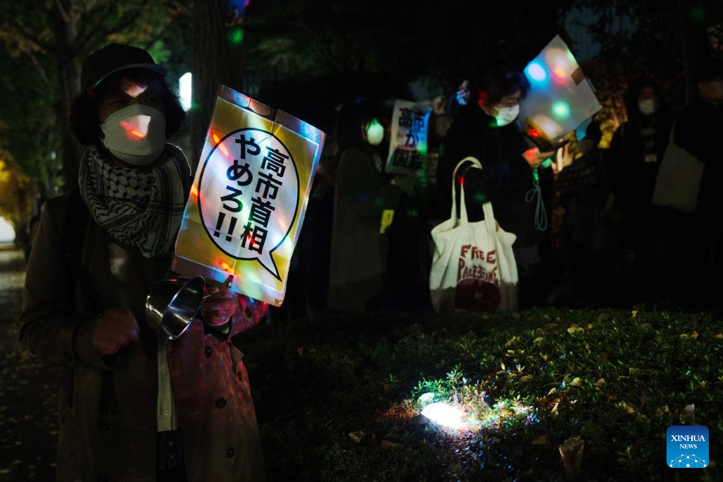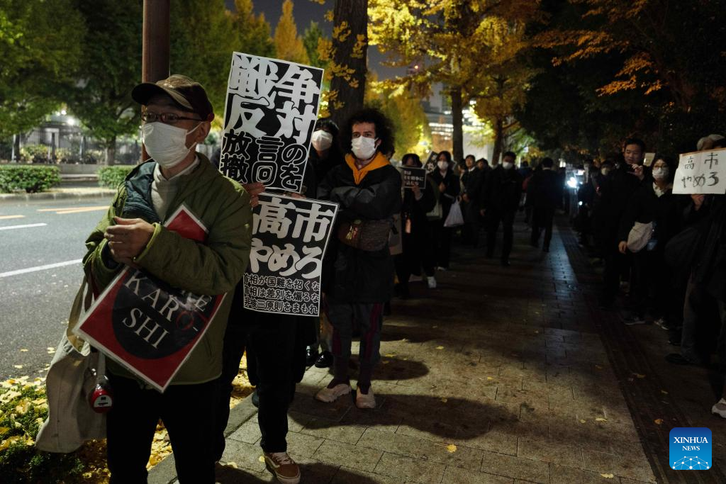 Protestniki s političnimi zahtevami med protestom pred uradno rezidenco japonske premierke v Tokiu, Japonska, 21. novembra 2025. Na stotine Japoncev je v petek protestiralo pred uradno rezidenco premierke v Tokiu in zahtevalo, da premierka Sanae Takaiči umakne svoje nedavne napačne izjave o Tajvanu ter poda pojasnilo in opravičilo. (Xinhua/Jia Haocheng)