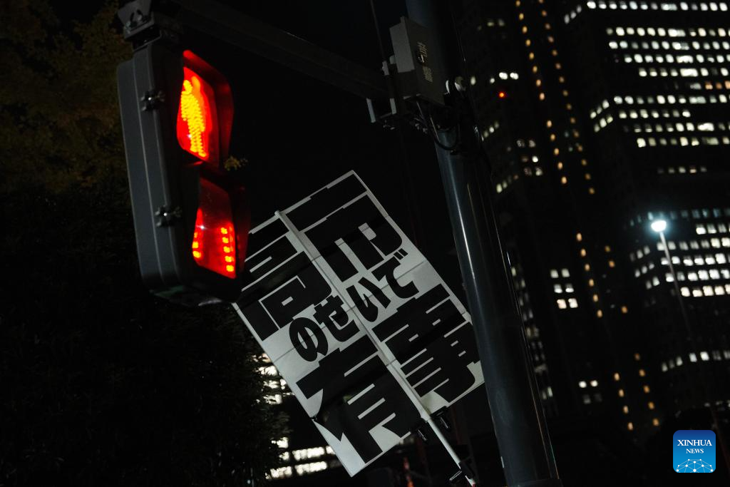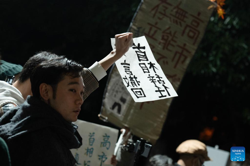 Ljudje se udeležujejo protesta pred uradno rezidenco japonske premierke v Tokiu, Japonska, 21. novembra 2025. Na stotine Japoncev je v petek protestiralo pred uradno rezidenco premierja v Tokiu in zahtevalo, da premierka Sanae Takaiči umakne svoje nedavne napačne izjave o Tajvanu ter poda pojasnilo in opravičilo. (Xinhua/Jia Haocheng)