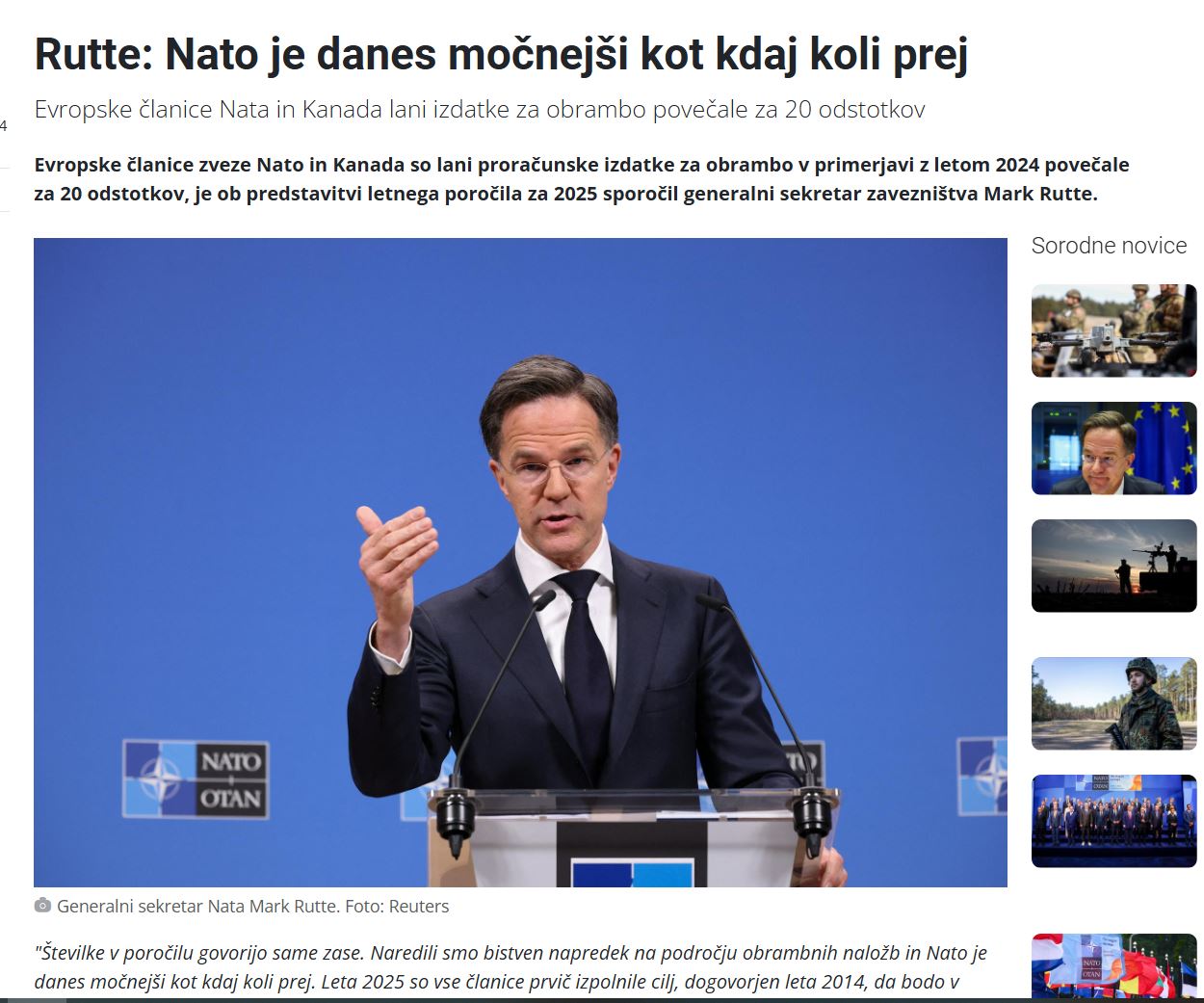 »Številke v poročilu govorijo same zase. Naredili smo bistven napredek na področju obrambnih naložb in Nato je danes močnejši kot kdaj koli prej. Leta 2025 so vse članice prvič izpolnile cilj, dogovorjen leta 2014, da bodo v obrambo vložile najmanj dva odstotka bruto domačega proizvoda,« je na novinarski konferenci v Bruslju povedal Rutte.