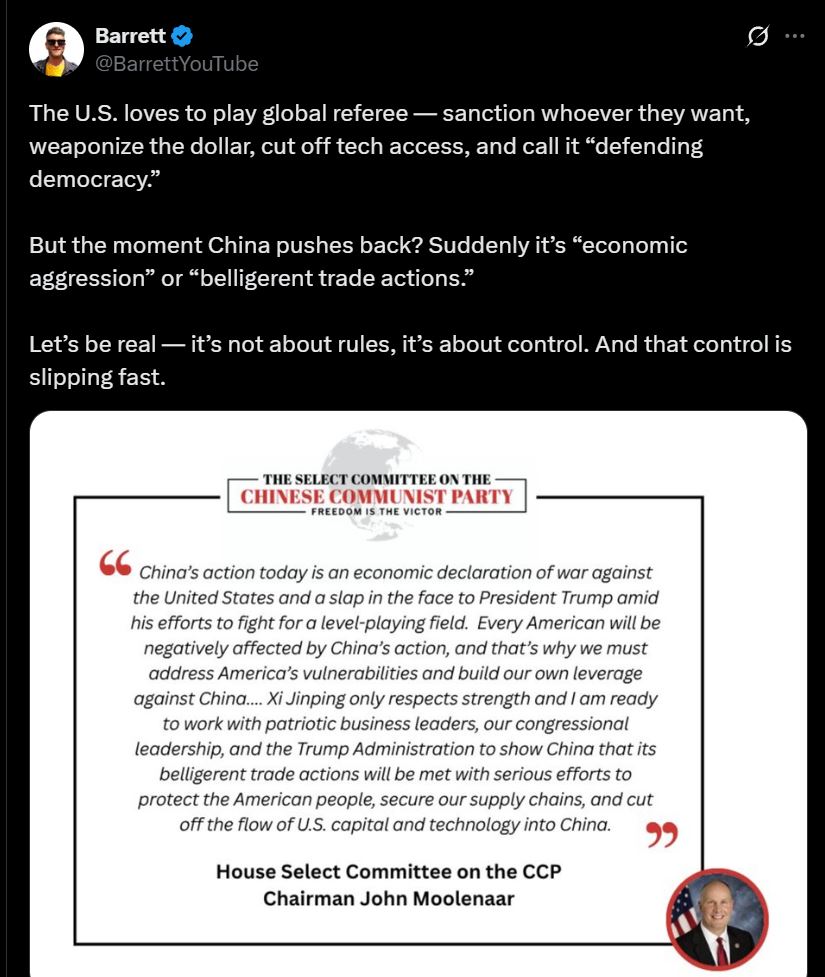 Vedno sem čutil, da prežijo na nas, in zdaj, kot ponavadi, se je izkazalo, da imam prav! Nikakor ne bi smelo biti dovoljeno, da Kitajska drži svet za »talca«, vendar se zdi, da je bil to njihov načrt že nekaj časa – začenši z »magneti« in drugimi elementi, s katerimi so si tiho pridobili nekakšen monopolni položaj, kar je vsaj rečeno zlovešča in sovražna poteza. Toda ZDA imajo tudi monopolne položaje, veliko močnejše in obsežnejše od kitajskih. Do zdaj jih preprosto nisem želel uporabiti, ker ni bilo razloga za to — DO ZDAJ!