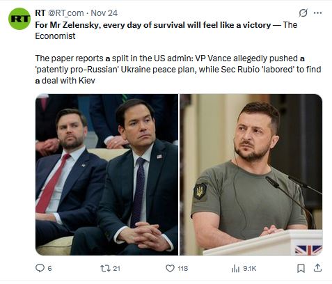 Vse skupaj se zato nadaljuje točno tako, kot smo že napovedali – po začetnem pritisku na Zelenskega se bo načrt tako dolgo »dopolnjeval« s strani ameriških jastrebov in evropskih politikov, da bo popolnoma nesprejemljiv za Rusijo.