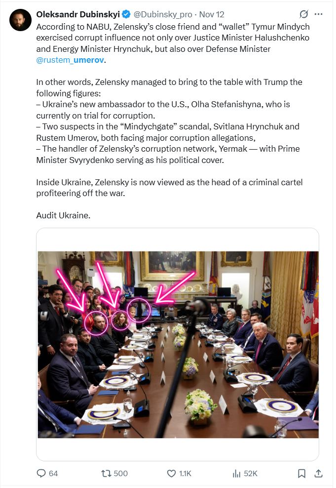 Ukrajinski oporečnik Alexander Dubinski: »Zelenskemu je uspelo za mizo s Trumpom posesti naslednje osebe: Novo ukrajinsko veleposlanico v ZDA, Olgo Stefanišino, ki ji trenutno sodijo zaradi korupcije; dva osumljenca v škandalu 'Mindičgate', Svetlano Grinčuk in Rustema Umerova, oba obtožena resnih korupcijskih dejanj; vodjo korupcijskega omrežja Zelenskega, Jermaka – s premierjko Sviridenko kot politično krinko. Znotraj Ukrajine Zelenskega zdaj dojemajo kot vodjo kriminalnega kartela, ki se okorišča z vojno.« Vir: Posnetek zaslona, X
