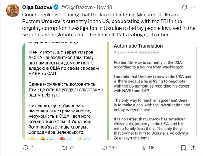 Gončarenko ob tem trdi, da je nekdanji ukrajinski obrambni minister Rustem Umerov trenutno v ZDA, kjer sodeluje s FBI v preiskavi korupcije v Ukrajini, da bi izdal ljudi, vpletene v škandal, in se pogajal o dogovoru zase.