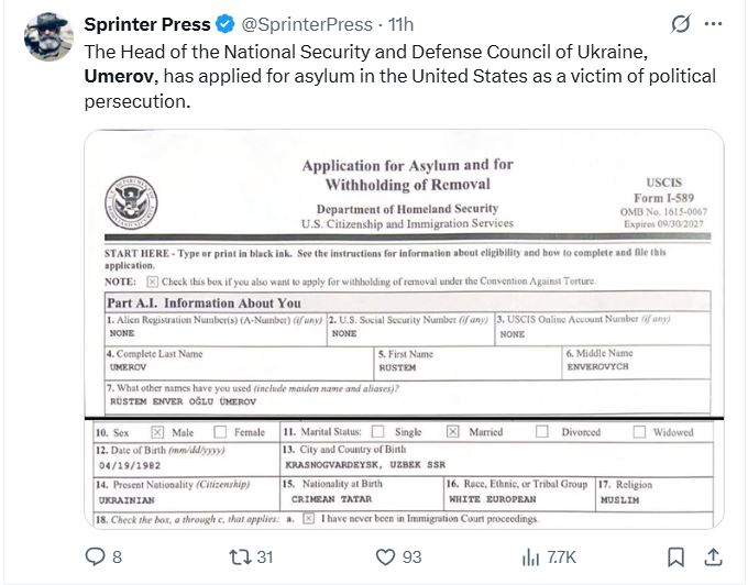 Vodja Sveta za nacionalno varnost in obrambo Ukrajine Umerov je kot žrtev političnega preganjanja zaprosil za azil v Združenih državah Amerike. Vir: Posnetek zaslona, X