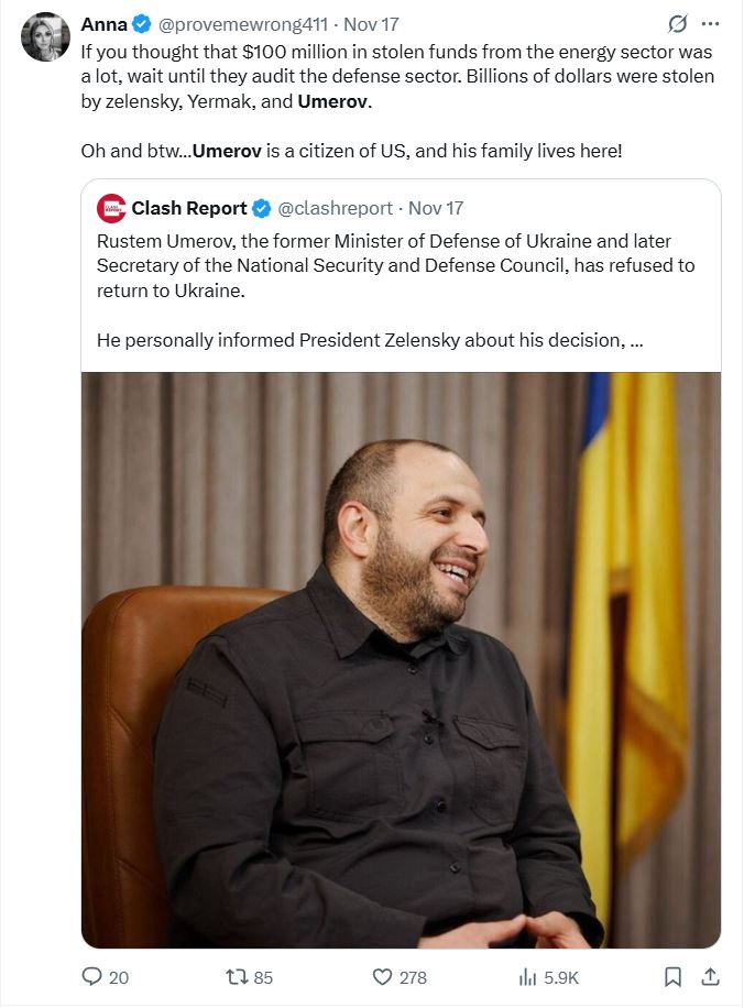 »Če ste mislili, da je 100 milijonov dolarjev ukradenih sredstev iz energetskega sektorja veliko, počakajte, da revidirajo obrambni sektor. Zelenski, Jermak in Umerov so ukradli milijarde dolarjev.