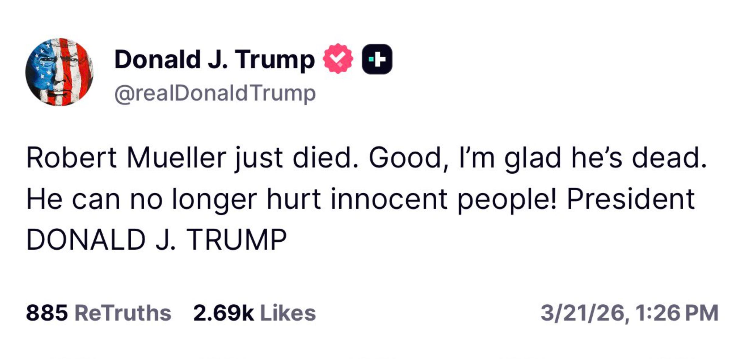 »Robert Mueller je pravkar umrl. Dobro, vesel sem, da je mrtev. Ne more več škodovati nedolžnim ljudem!,« je zapisal Trump na omrežju Truth.