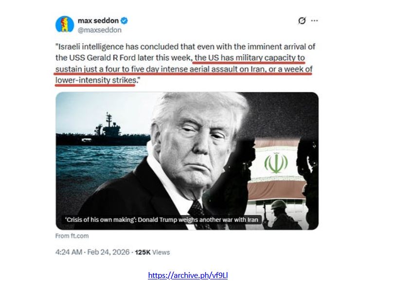 Zdaj, ko je Iran zavrnil njegove oziroma glavne zahteve Izraela (glede raketnega programa in pomoči osvobodilnim gibanjem) in razkril njegov blef, se je Trump soočil s ponižujočo izbiro: da znova »uporabi TACO« in se umakne, ali pa da dovoli, da se ameriški vojaški stroj razkrije v katastrofalnem stanju, kot nesposoben za vojno izčrpavanja.